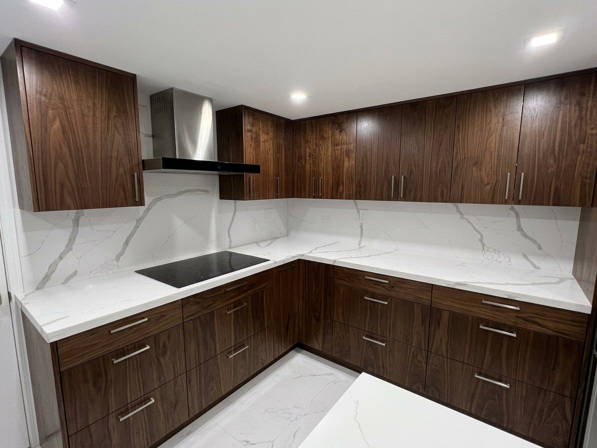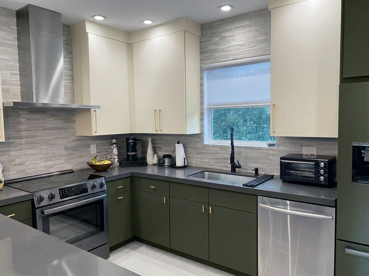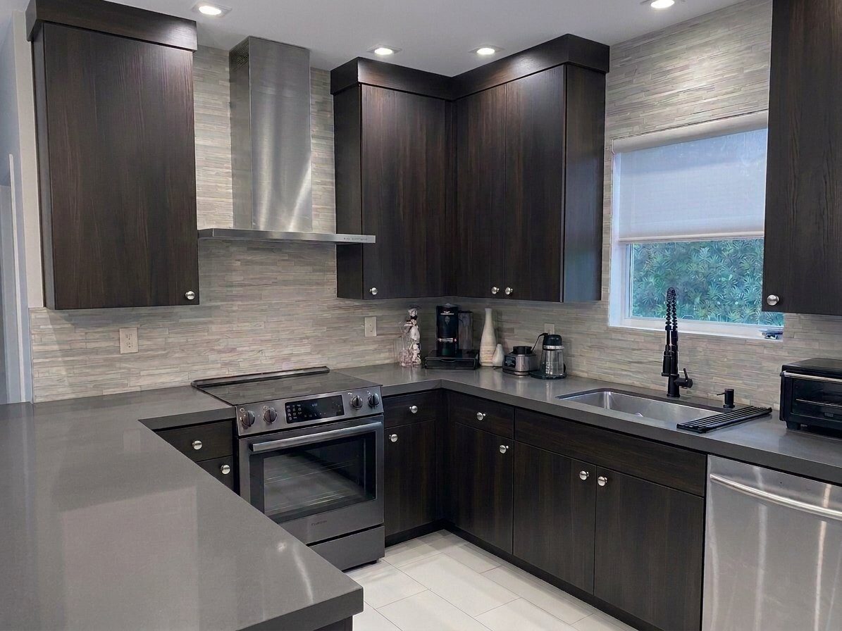 Before & after transformations of kitchens resurfaced with professional-gradevinyl wrapping – no demolition, no downtime.